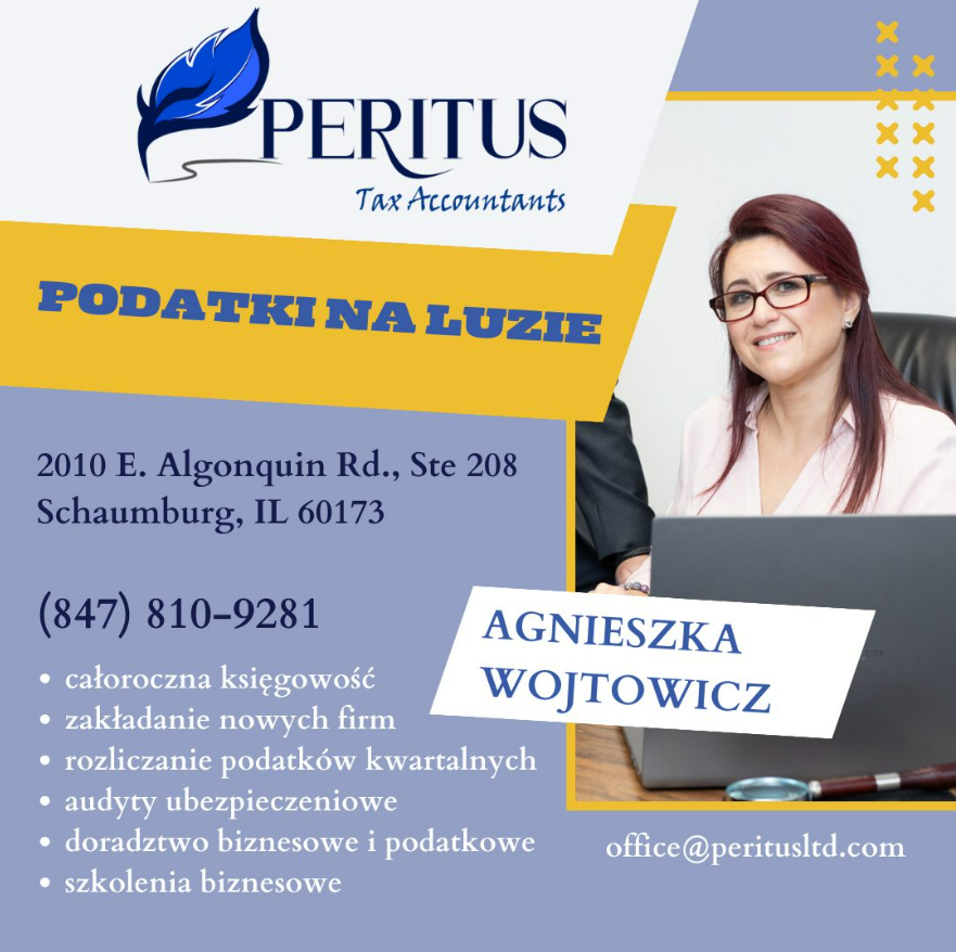 Agnieszka Wojtowicz, zalozycielka i Prezydent firmy ksiegowo-podatkowej Peritus, Ltd. Podatki na Luzie, pomaga od wielu lat Polakom mieszkajacym w USA i poza granicami, przy zakladaniu nowych Korporacji i LLC, rozliczaniu Podatkow Biznesowych i Personalnych, prowadzeniu rozliczen kwartalnych (Payroll), przygotowywaniu do Audytow Ubezpieczeniowych (Worker’s Compensation & Liability), zarzadzaniu Caloroczna Obsluga Ksiegowa, i doradzaniu w sprawach biznesowych,